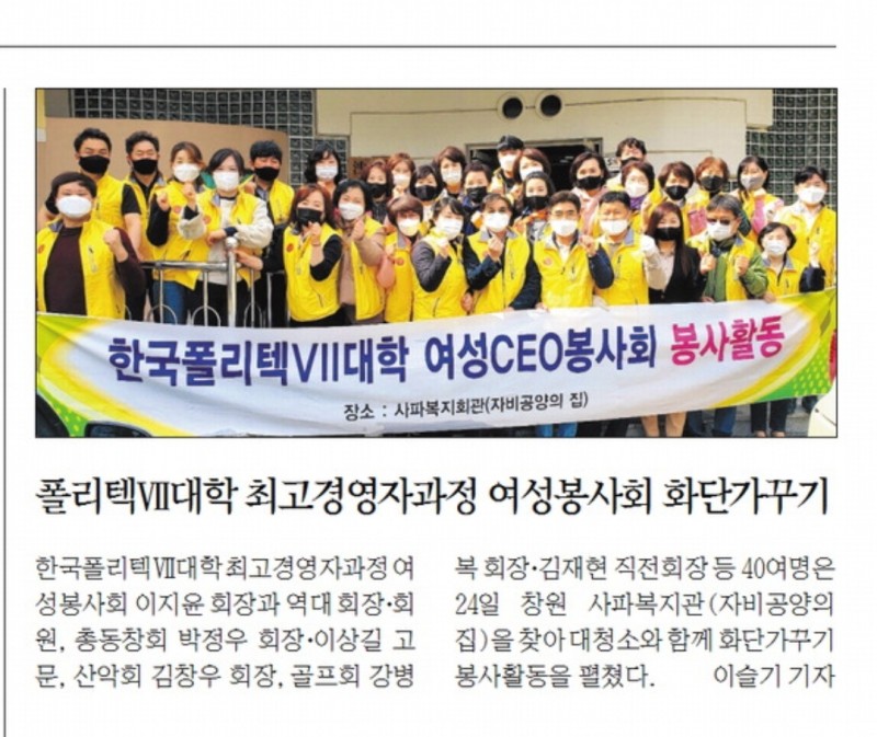 21년 3월 24일 (주)성우 이상길 대표는한국폴리텍Vll대학 최고경영자과정 여성봉사회의 고문으로 있으며, 창원 사파복지관(자비공양의집)을 찾아 대청소와 화단가꾸기 봉사활동에 참여하였습니다.