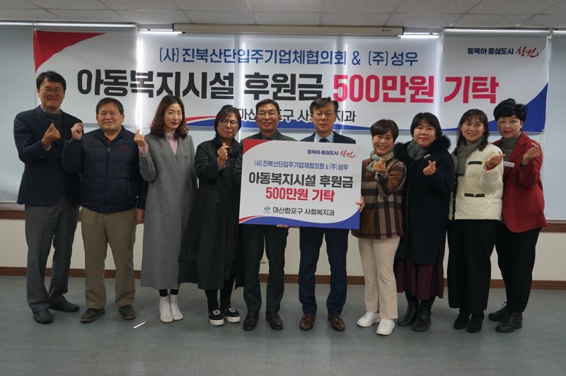 (주)성우 이상길대표와 이상길대표가 회장으로 역임하고 있는 진북산단입주기업체협의회에서 마산합포구 사회복지과에 아동복지시설 후원금을 전달하였습니다.